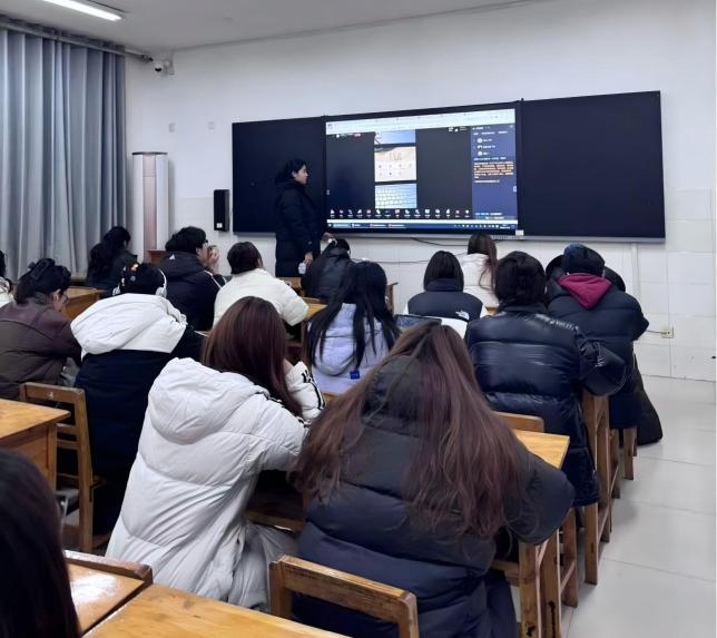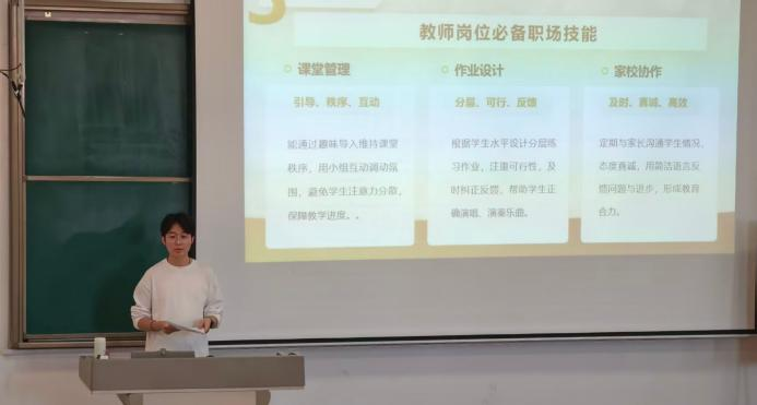 朱文轩学长以自己参加山东省师范类高校学生从业技能大赛的经历为主要内展开此次分享会,从职业目标、自我能力分析、比赛经验以及行动计划方面,为同学们分享求职经验,让同学清晰的认识到“以赛促学”的重要性。他的分享深入浅出、逻辑清晰,在现场引发了强烈共鸣。同学们纷纷表示,学长的经验如同为一盏明灯,照亮了他们的备赛与求职之路,极大地增强了他们提升专业技能、迎接未来挑战的信心与决心。